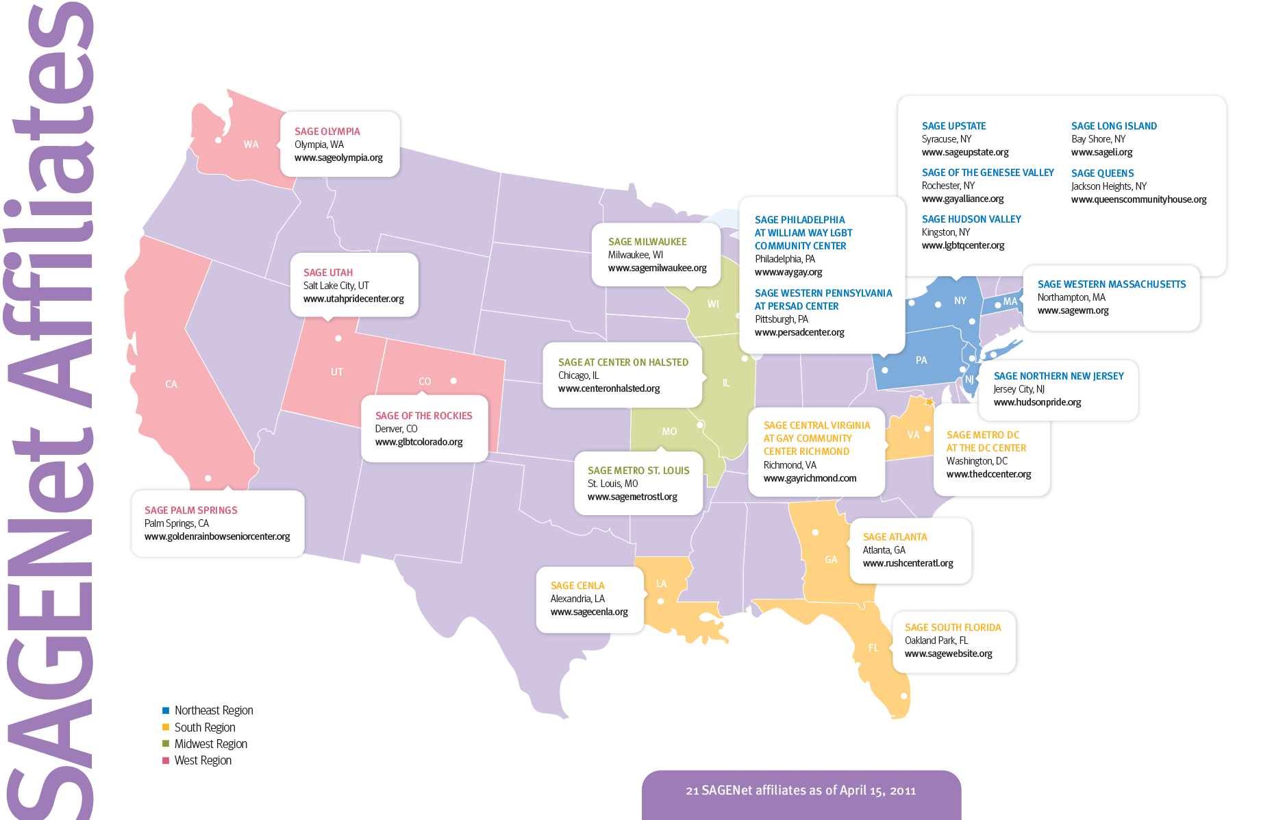 A network of state and local affiliates throughout the country that advanced LGBTQ older adult policies and programs, coordinated by SAGE (led by Serena Worthington, 2010-2019).